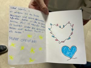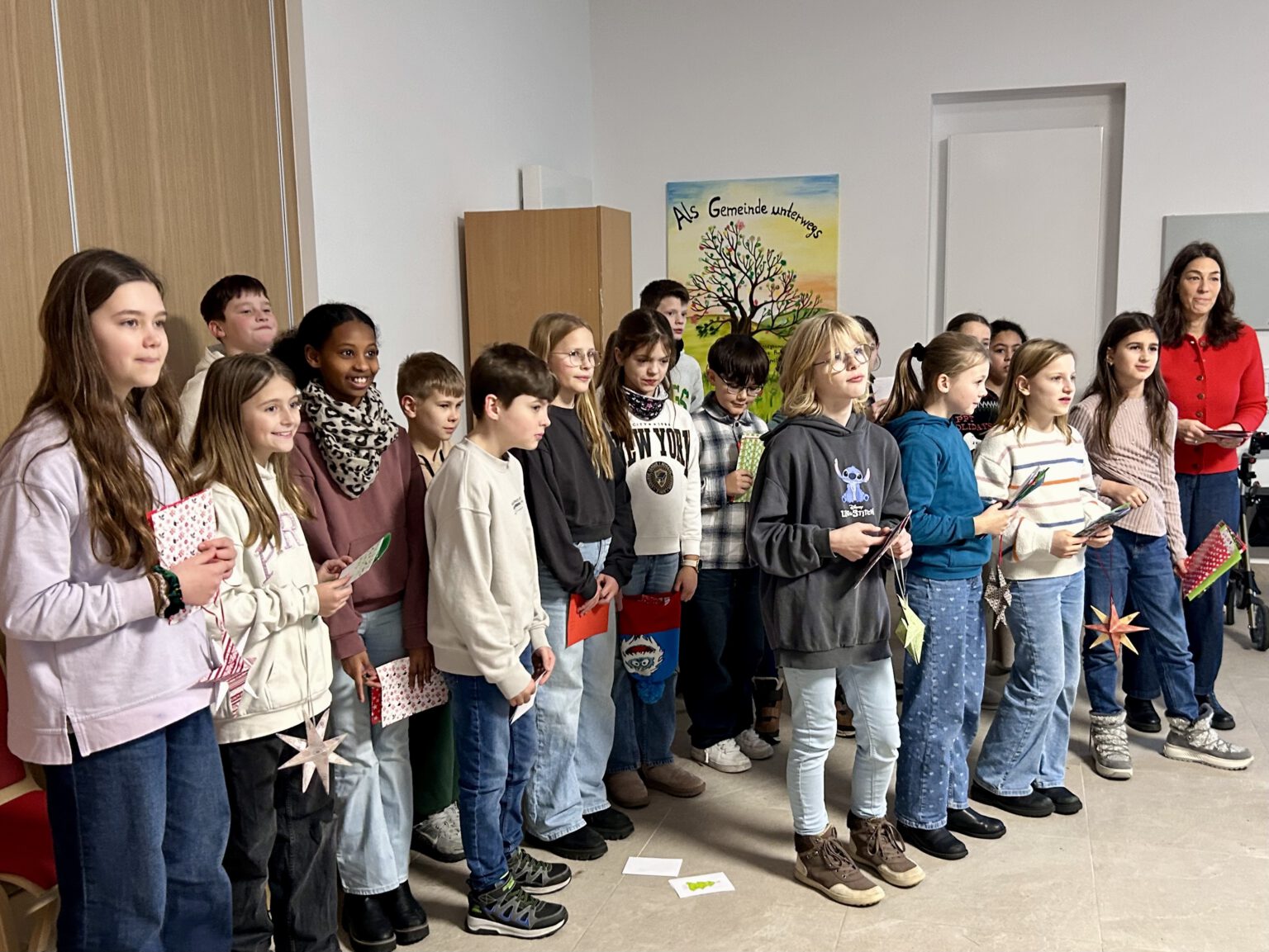 Sie haben Weihnachtskarten gebastelt, gemalt, Gedichte ausgesucht, liebe Wünsche aufgeschrieben und Weihnachtslieder geprobt. SchülerInnen der 5. und 6. Schuljahre des Städt. Lindengymnasiums Gummersbach, waren mit ihrer  Lehrerin im Seniorenzentrum St. Elisabeth zu Gast und haben weihnachtliche Stimmung mitgebracht. Mit den SeniorInnen gemeinsam sangen sie O Tannenbaum, Ihr Kinderlein kommet und Stille Nacht – auch wenn der Heilige Abend noch einige Tage entfernt war. Anschließend haben sie ihre liebevoll gebastelten Karten übergeben und sind mit den alten Menschen ins Gespräch gekommen, auch wenn einige SchülerInnen zuvor ein bisschen unsicher waren, weil sie so selten Kontakt zu älteren Menschen haben. Auf die Frage, was sie sich (außer Geschenken😊) an Weihnachten wünschen, kam die übereinstimmende Antwort: „Dass ich meine Familie treffe, die ich sonst so selten sehe und dass es allen gut geht.“